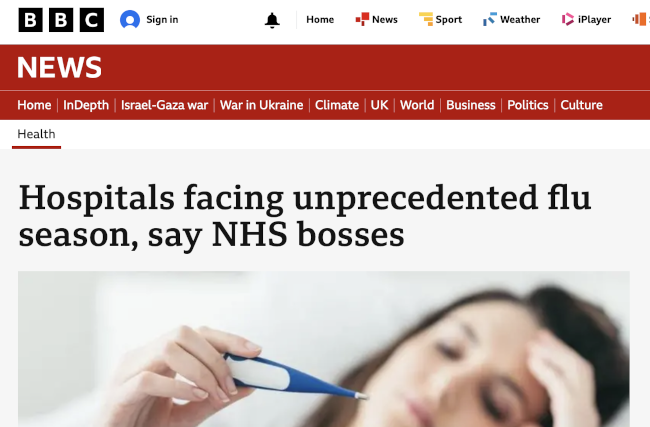 According to the BBC, the number of flu patients in hospital has hit a record high in England for this time of year with NHS leaders warning the country is facing an unprecedented flu season. -