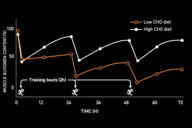 Back-to-back sessions, limited recovery windows and high training loads make fuelling during exercise essential. Preventing excessive glycogen depletion makes post exercise recovery easier and supports long-term adaptation. The graph below highlights the comparison between a high and low carbohydrate diet and how the two diets impact stored carbohydrate availability over multiple sessions. Interestingly, the same graph could equally represent our performance within each session. As carbohydrate starts to deplete, we will almost certainly see a reduction in our ability to perform.