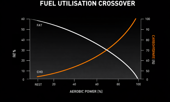 At low exercise intensities, both fat and carbohydrate contribute to energy production. As intensity increases, the contribution from carbohydrate increases until it becomes the predominant fuel source. In short, the harder we exercise the more carbohydrate we burn and the more we need to consume. You will notice at 70% of our aerobic capacity, carbohydrate becomes the predominant fuel source, and this is called the aerobic fuel utilisation crossover. The take home message: carbohydrate consumption is key at all exercise intensities.